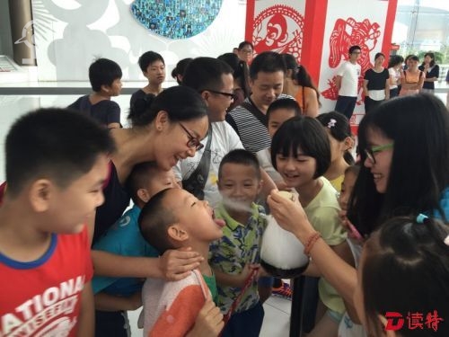 孩子们在快乐地“品尝”干冰可乐。